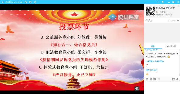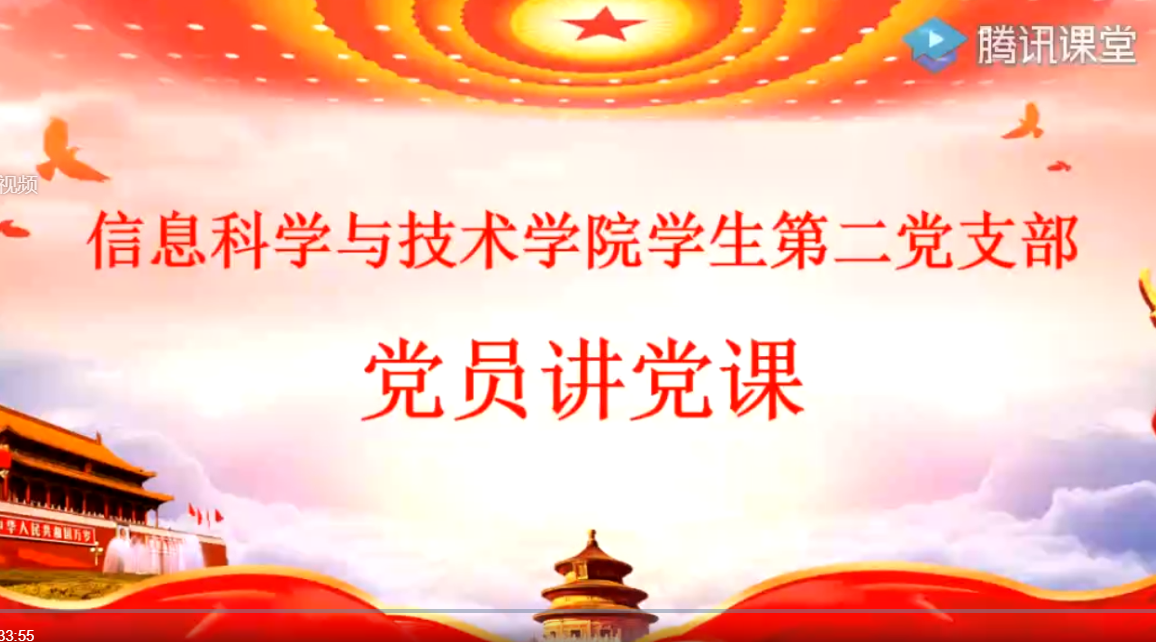 为了切实做到“党的课程上线、党的活动在线、党员意识不离线”,进一步落实以“云”育人党建工作,信息科学与技术学院第二学生党支部把党的组织生活搬上云端,于2020年4月30日利用腾讯课堂开展主题为“点亮思想,擦亮形象”的“党员讲党课”比赛党日活动。支部书记邓艳桃、副书记田旭峰,全体党员及积极分子全员参与。