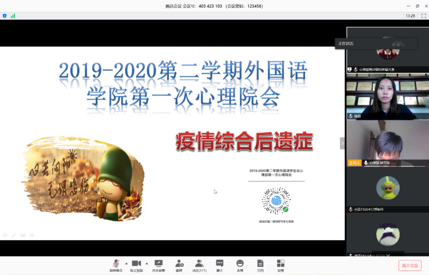 为引导学生做好“后疫情时代”的心理调适工作,培养学生积极的心态,充分发挥朋辈帮扶作用,5月14日下午,外国语学院于腾讯会议平台召开心理院会。出席本次会议的有外国语学院辅导员邓永权和陈韵,学院全体非毕业班心理委员和宿舍心康员参加本次会议。会议由心理部梁文锋和苏楚如主持。