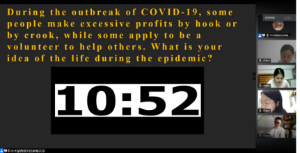 本次英语演讲大赛主题为:为爱发声,以声战疫。复赛题目则是:During the outbreak of COVID-19,some people make excessive profits by hook or by crook, while some apply to be a volunteer to help others. What is your idea of the life during the epidemic?