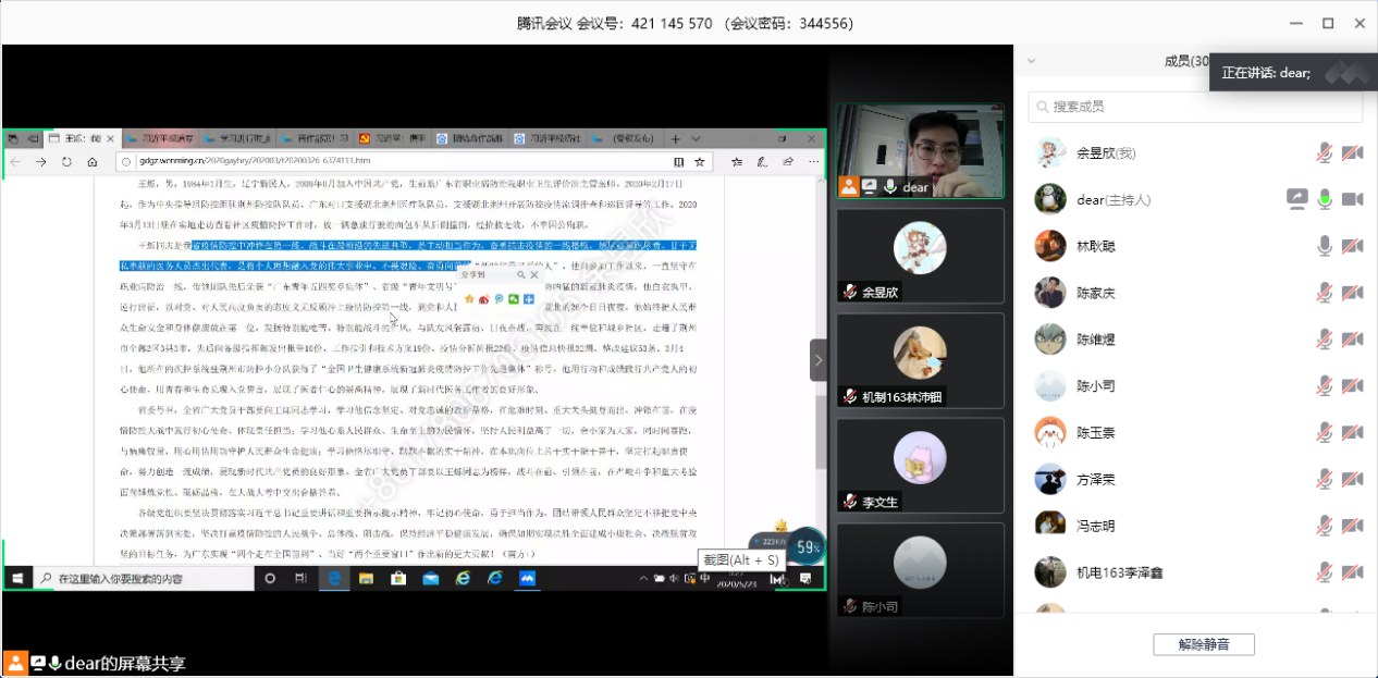 接着,熊伟老师与支部全体党员一同学习王烁同志事迹视频,随后,与会党员纷纷分享了自身的感受与想法。欧德亿同志表示,如习总书记在十三届全国人大三次会议内蒙古代表团的审议时所提到的“把人民生命安全和身体健康放在第一位”,党始终是把“人民”二字放心中,这是十分坚定的;吴梓燊同志首先对王烁等优秀同志表示缅怀与惋惜,并对榜样的力量表示肯定。在这些优秀同志的身上,能清清楚楚地看到“责任重于泰山”的品质,是十分值得我们学习的;李泽鑫同志表示,国家对于民生保障本就是不容易的一件事情,但是如今却做到了尽善尽美,这是我们国家制度优越性的体现,更是党的正确领导的表现。