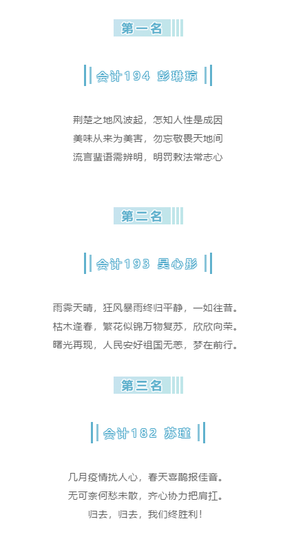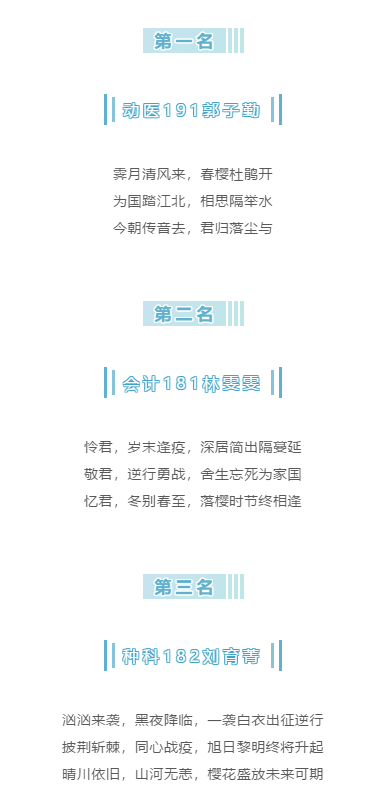 在第一阶段“感念”的比赛创作中,参赛者发表了对这次突如其来的疫情的感慨,表达了对“疫情无情,人间有情”的理解以及对医护、基层工作人员的敬仰之情。通过线上评选,获得第一阶段前三名的选手是:动医191郭子勤、会计181林雯雯、种科182刘育菁。