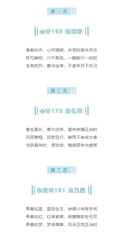 经过主题的层层递进,最后迎来第三阶段“致青春梦想”。都说青春能托举起梦想,梦想能为青春指引方向。大家书写下对青春梦想的诠释,作为青年一代亦当不馁不惧,奉献青春之力,践行青春之想!通过线上评选,获得第三阶段前三名的选手是:会计195陈湘婷、会计172庄礼敏、物联网191朱乃豪。