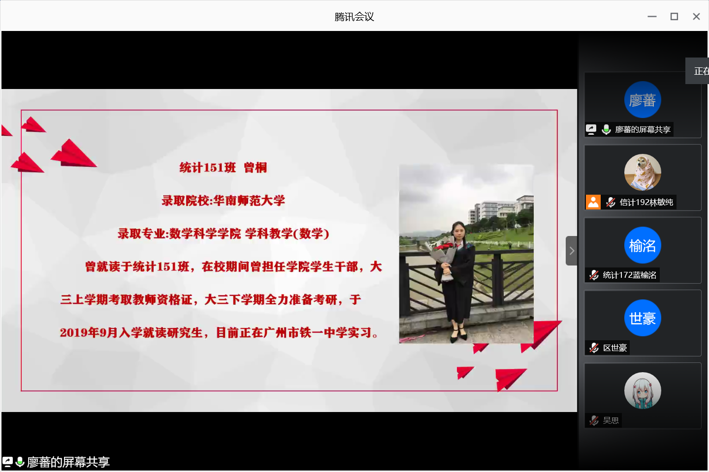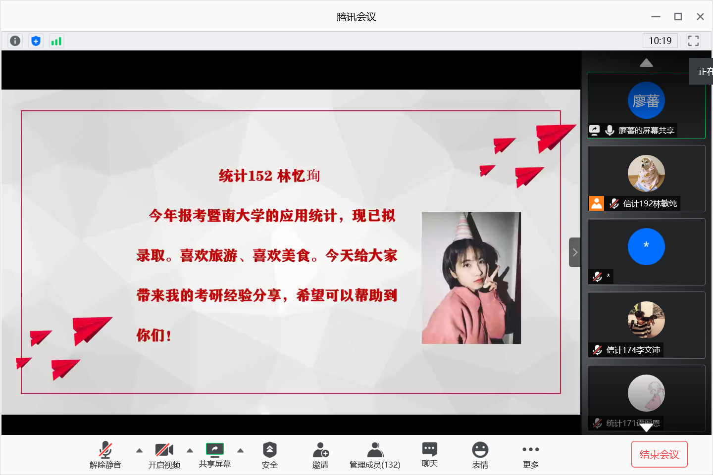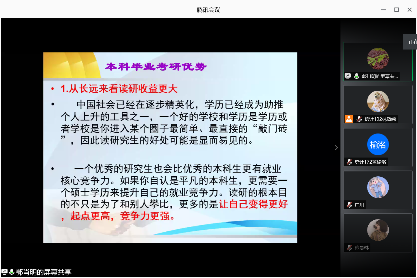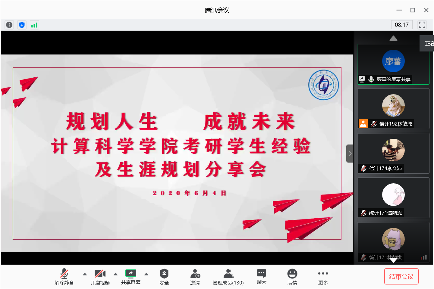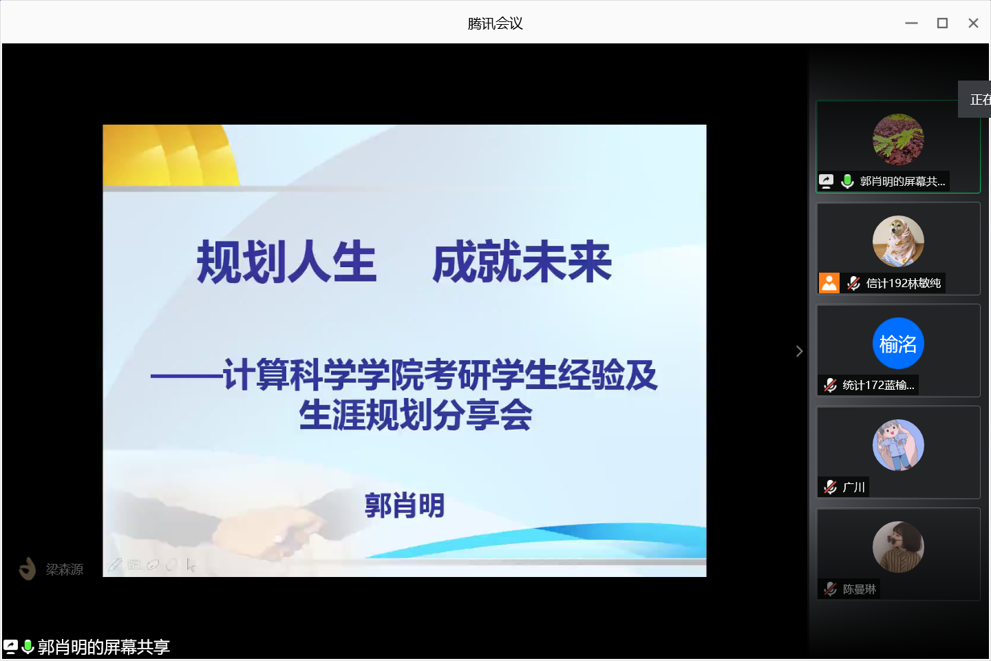 2020年6月4日晚,计算科学学院通过腾讯会议网络平台召开考研学生经验及生涯规划分享会,参加本次分享会的有学院党总支副书记郭肖明、辅导员廖蕃、统计专业教研室主任杨志伟、数学系主任黄业辉,2019届及2020届考研学生、2017级全体学生以及18-19级部分学生。