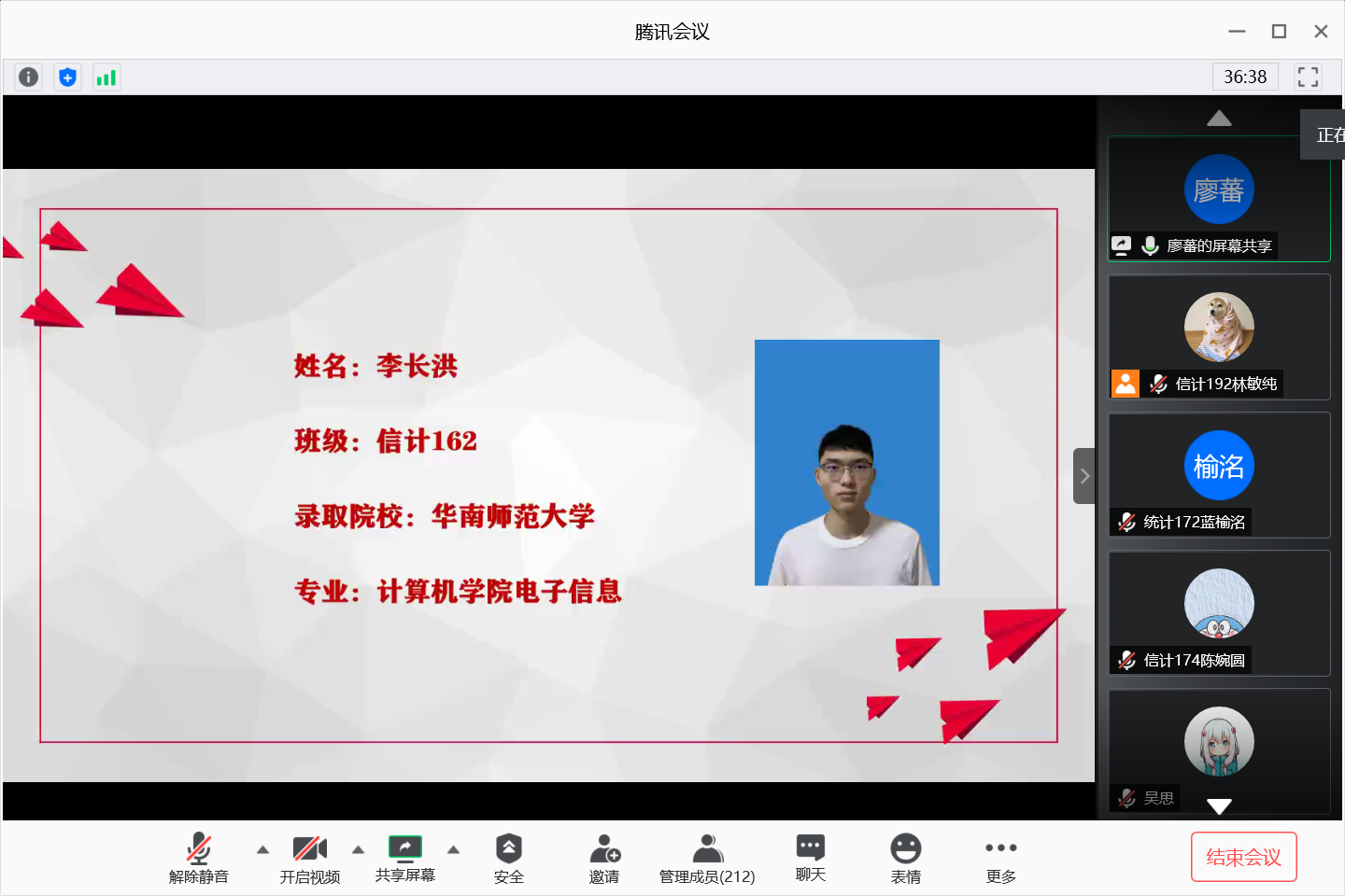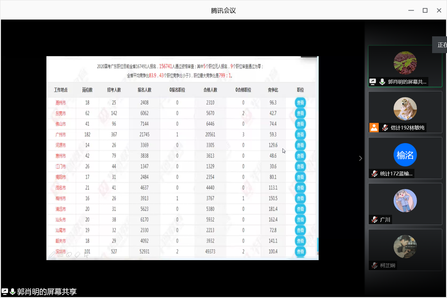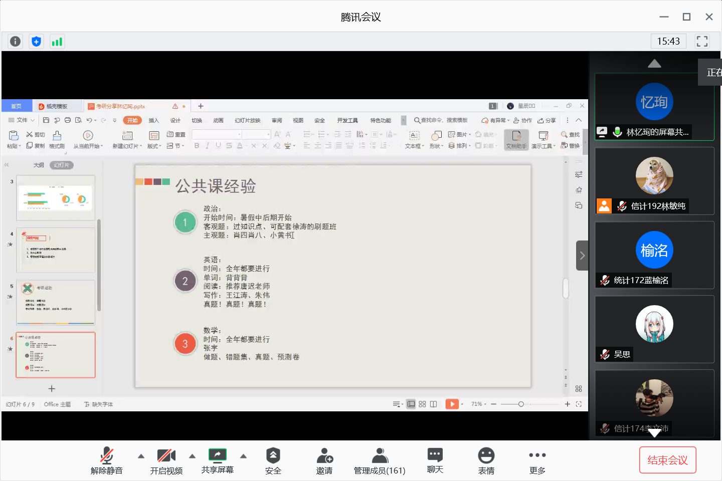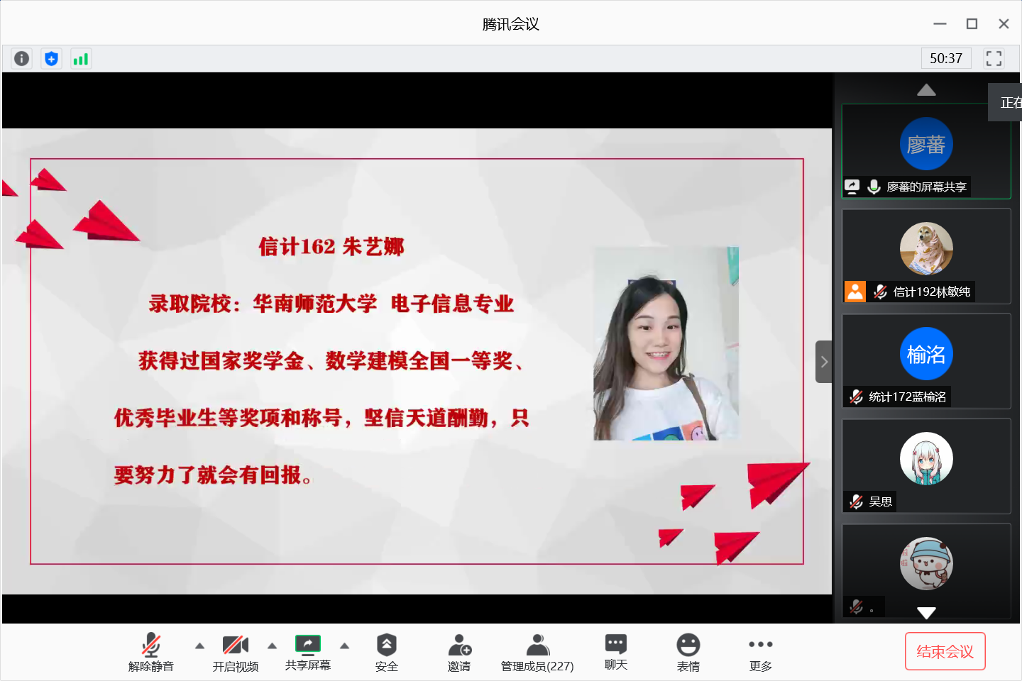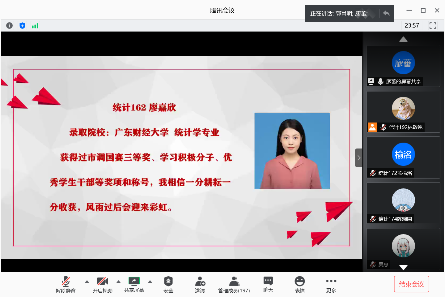 2020年6月4日晚,计算科学学院通过腾讯会议网络平台召开考研学生经验及生涯规划分享会,参加本次分享会的有学院党总支副书记郭肖明、辅导员廖蕃、统计专业教研室主任杨志伟、数学系主任黄业辉,2019届及2020届考研学生、2017级全体学生以及18-19级部分学生。