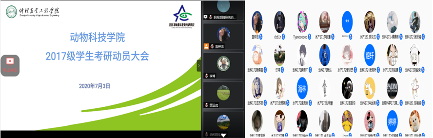 为充分调动学子的考研积极性,坚定考研信念,充分挖掘自身潜能,7月3日晚上,动物科技学院通过腾讯会议平台召开考研经验分享暨2020届考研动员大会,本次会议邀请了党总支书记欧坚泉、副院长黄运茂进行线上指导,考研毕业生优秀代表分享考研经验,副书记朱路平、辅导员许鸿、李博以及2017级全体学生参加了会议。