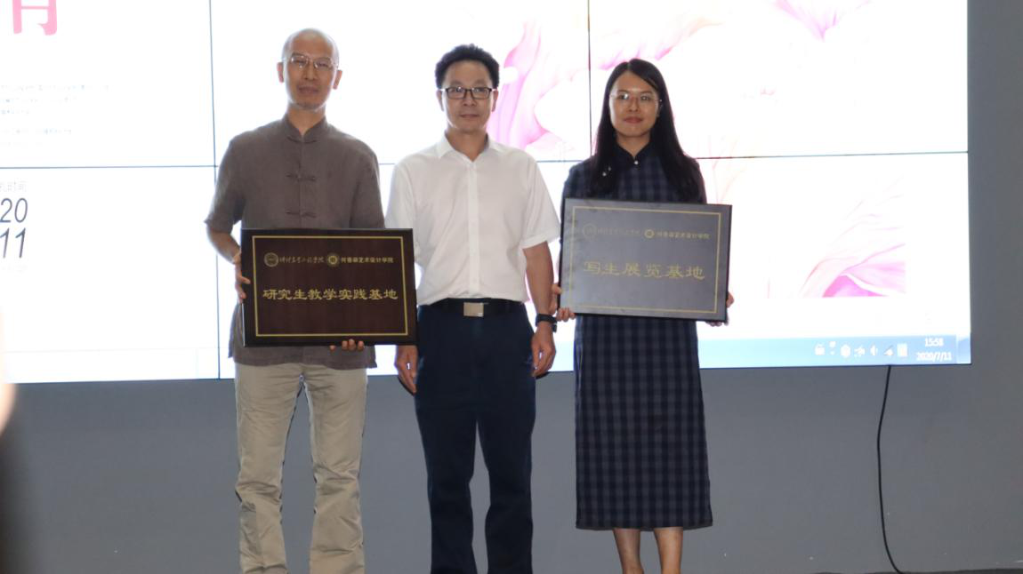 在领导嘉宾发表致辞后,田允波教授为春睡画院美术馆授牌。春睡画院美术馆馆长刘思东、副馆长马漫漫接受研究生教学实践基地、写生展览基地授牌。