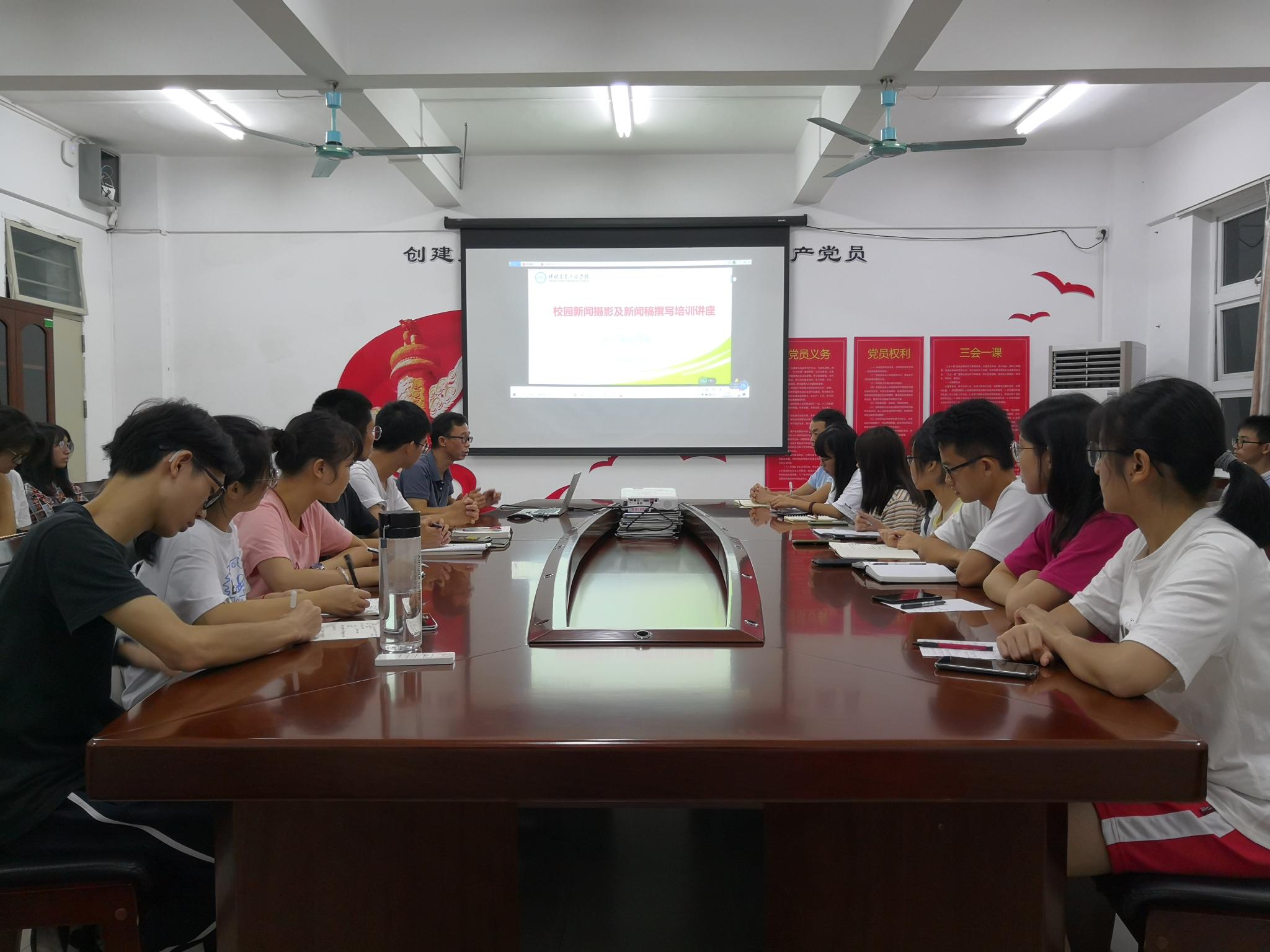 9月23日晚,轻工食品学院在白云校区刘宇新楼313会议室举办“校园新闻摄影及新闻稿撰写培训”讲座。讲座由该院党总支副书记李汉雄主讲。该院及其他学院负责宣传工作的团学组织学生干部共40多人到场聆听。
