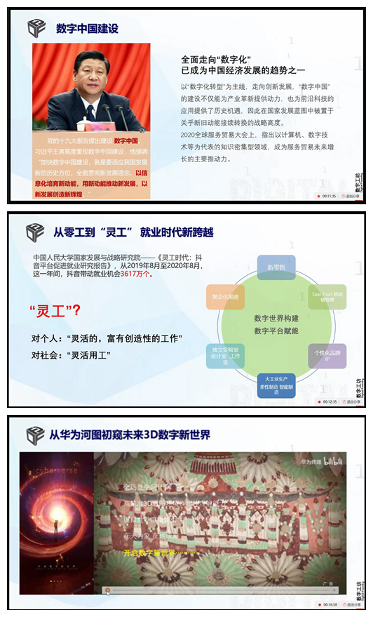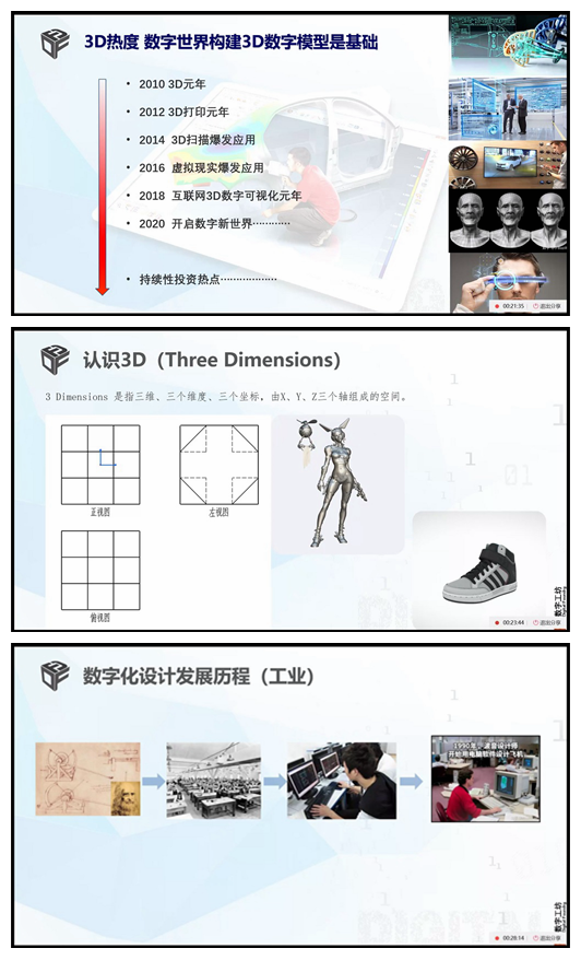 陈姝副院长首先致开场辞,她对参与线上讲座的老师和同学表达亲切问候,并对出席讲座的嘉宾表示感谢。她谈到,机电工程学院一直以来非常重视创新创业教育,积极参加各类学科竞赛。学院每年组织多个代表队伍参加全国数字化(3D)创新设计大赛。在上一届比赛中,我院取得了可喜的成绩(全国一等奖、二等奖、三等奖各1项、广东赛区特等奖1项、一等奖1项,其他奖项多个)。历届大赛,我院均夺得全国一等奖等奖项多项,希望同学们积极参赛从中提升自己的综合能力,希望与会同学能有所收获,有所启发。接着,匡伟秘书长讲到全面走向“数字化”已成为中国经济发展趋势之一。他从“零工到灵工,你离数字世界还有多远”、“从华为河图初窥未来3D数字新世界”、“三维数字化技术的前世今生”、“全国3D大赛,青年领袖、数字英雄”、“数字工坊”“新灵兽实验室,与全国千万大学师生一起创新创造创业”等六个方面阐述了数字新世界的发展现状和未来趋势;接着,他就全国三维数字化创新设计大赛背景、大赛亮点、参赛条件、赛程介绍、报名流程以及赛后创业服务这六个方面为大家一一介绍了参赛明细。他还特别提到要“以赛促学、以赛促教、以赛促新”。参赛团队以项目化作品为契机,从大赛中来到实际运用中去,让项目化的大赛作品正真实现创新创业,让大家对创新创业局势有了更加深刻的认识,也激发同学们在数字化设计创新项目方面有了更多新的理解和想法;陈姝院长作了总结发言,希望全体学生要以匡伟秘书长这次讲座报告为契机,紧跟数字时代的步伐,善于运用数字技术,创新理念和创新手段,推进创新创业实践,提升创新创业实践能力。