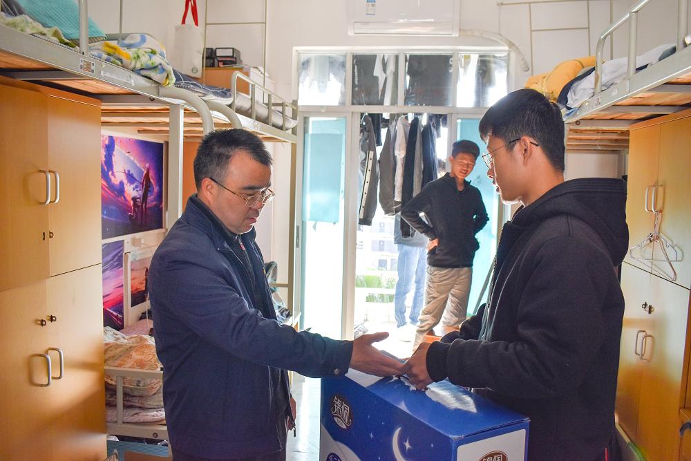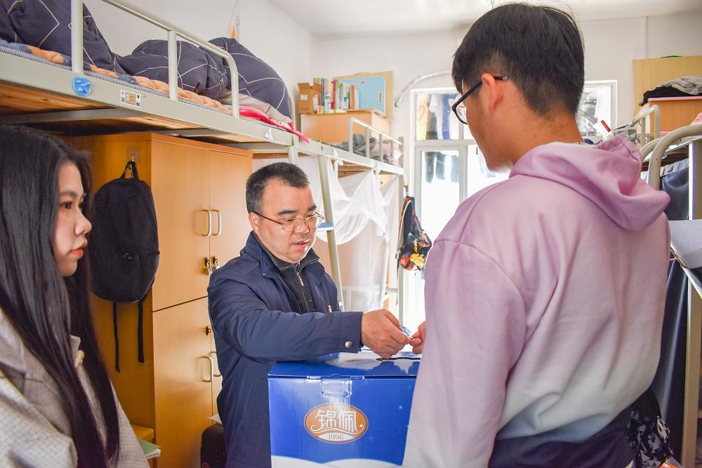 在走访期间,何宝国副书记与同学亲切交谈,详细地了解学生的家庭情况、学习情况等相关情况,提醒他们注意添衣保暖,同时询问同学们冬季御寒物品的置办情况,并亲手为同学们送上被褥。随后,他勉励同学们要以坚毅的精神、阳光的心态来面对生活和学业,并对同学们提出几点希望:一是要珍惜宝贵的大学时光,发扬艰苦奋斗的精神,主动肩负起新时代强农兴农的使命;二是要锻炼身体,努力学习,坚信知识改变命运,自立自强,牢记“注重实践,扶助农工”的校训;三是要懂得感恩,努力成长成才,将爱心传递下去。