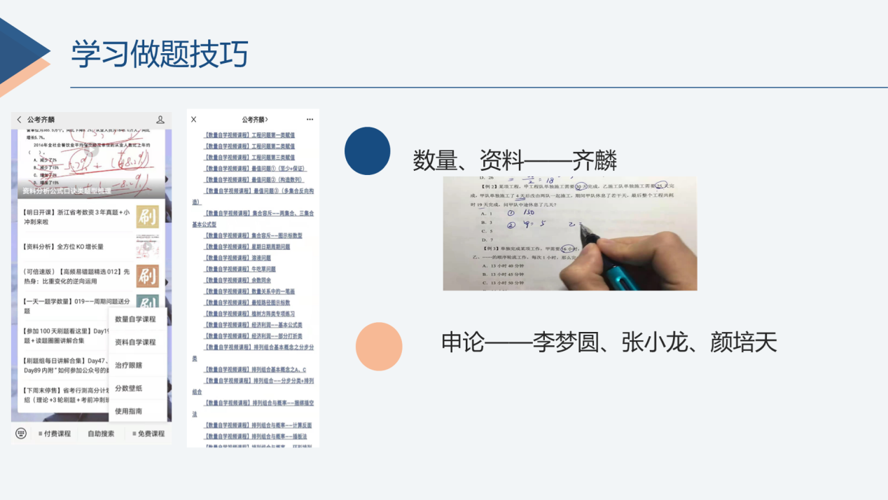 会议伊始,陈思颖讲述了自己考公的初心,她强调作为一名共产党员,要践行全心全意为人民服务的宗旨。接着,她从基础学习、专项提升、刷题阶段和冲刺阶段这四个部分为大家介绍了考公过程中的一些方法与经验,强调了要分模块学习、注重做题的技巧,、提高做题速度与准确率。