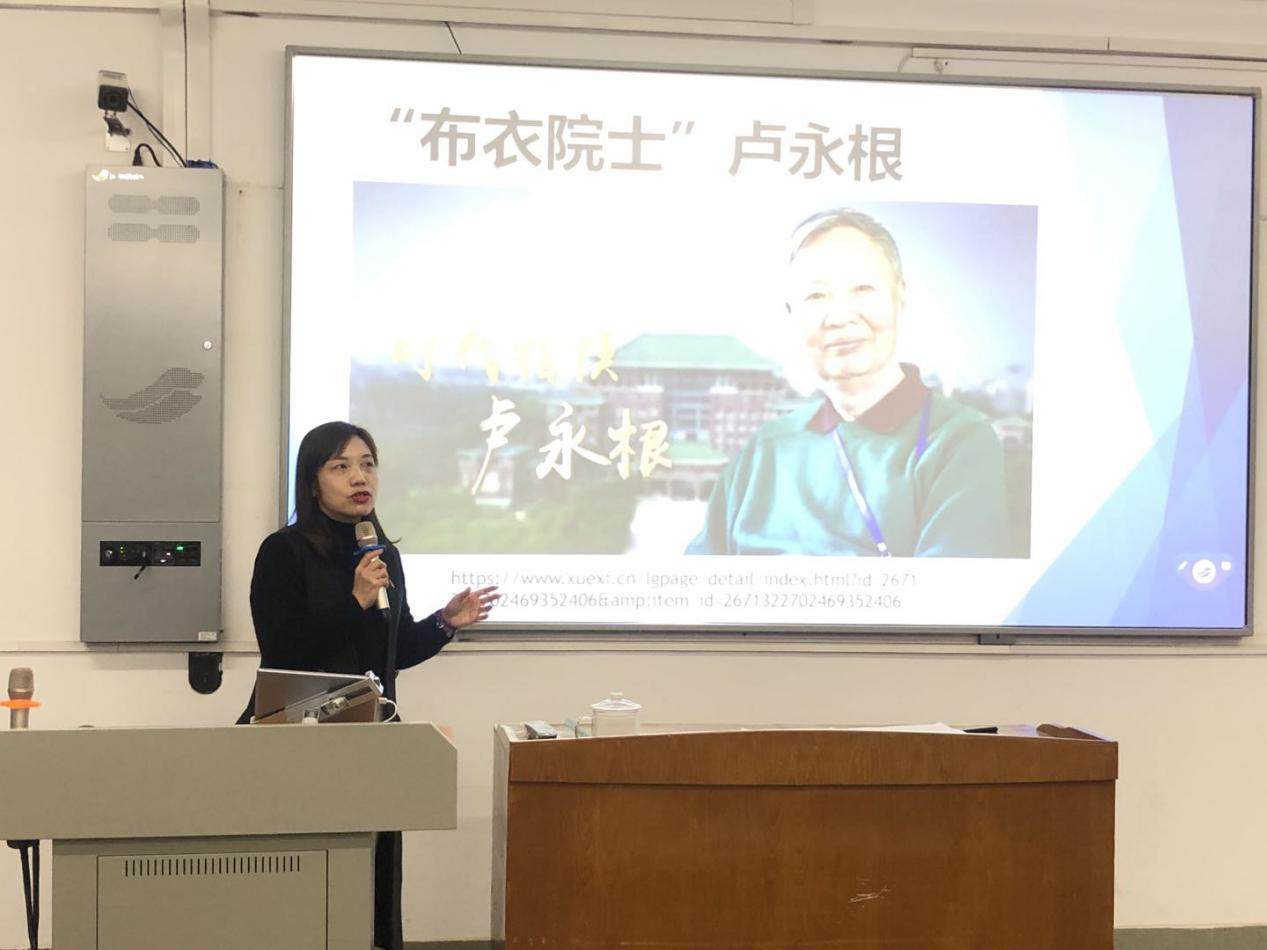 郭肖明带领全体教工党员学习卢永根院士的先进事迹。卢永根院士是我国著名农业科学家、作物遗传学家。他学高德馨、治学严谨,满腔热情投身水稻遗传育种研究,取得一系列重要研究成果。卢永根院士学术贡献富裕,他带领团队选育出的农作物新品种就有33个,在华南地区累计推广面积1000多万亩,新增产值就超过15亿元;但自己家中却“家徒四壁”,穿不讲究、吃不挑剔,一床简席、四壁白墙。他说“党培养了我,将个人财产还给国家,是作最后的贡献”。他廉洁奉公,担任华南农业大学校长12年间,不断推动改革,受到师生们的好评;他使命在肩,初心不忘,即使卧病在床,也不忘过组织生活;他奋斗终身、淡泊名利,将一辈子省吃俭用攒下的880余万元全部捐献给学校,并决定在去世后将遗体无偿捐献给医学科研事业,他被称为“布衣院士”的“时代楷模”,被追授“全国优秀共产党员”称号。