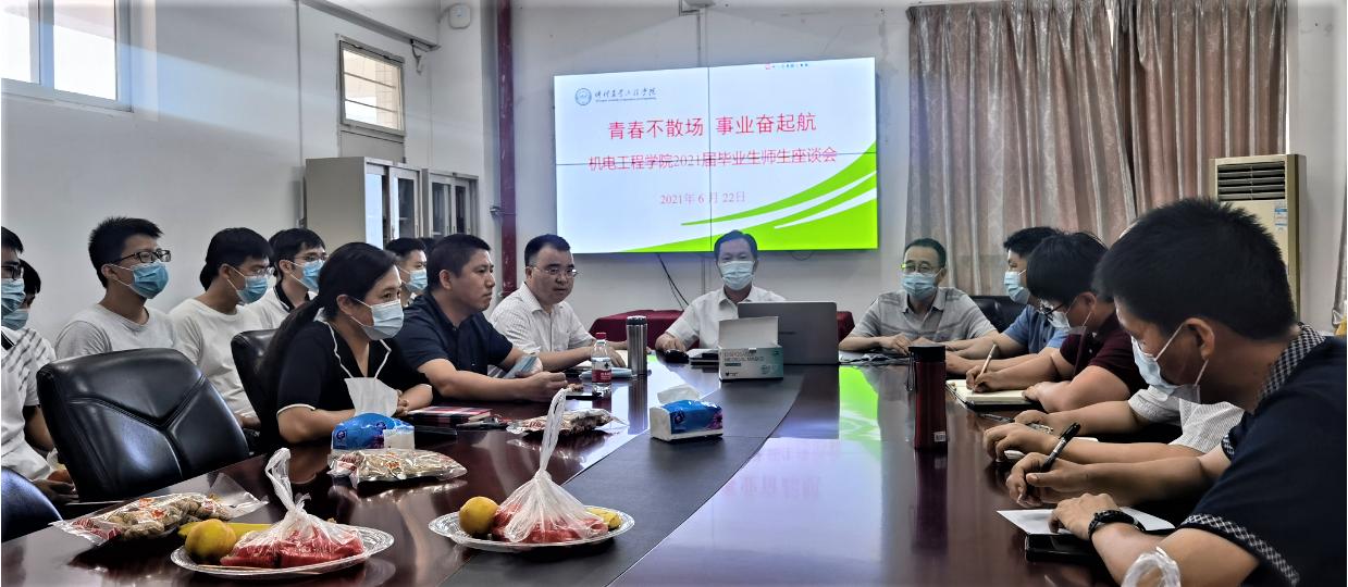 为了加强与毕业生交流,征集毕业生对学校和学院发展的建设性意见,进一步提高学院整体办学水平,6月22日上午,机电工程学院在白云校区举行了主题为“青春不散场,事业奋起航”的2021届毕业生师生座谈会。该院党政班子成员、系主任、教师代表、辅导员以及2021届本科毕业生代表参加了座谈会。会议由学院党委副书记何宝国主持。