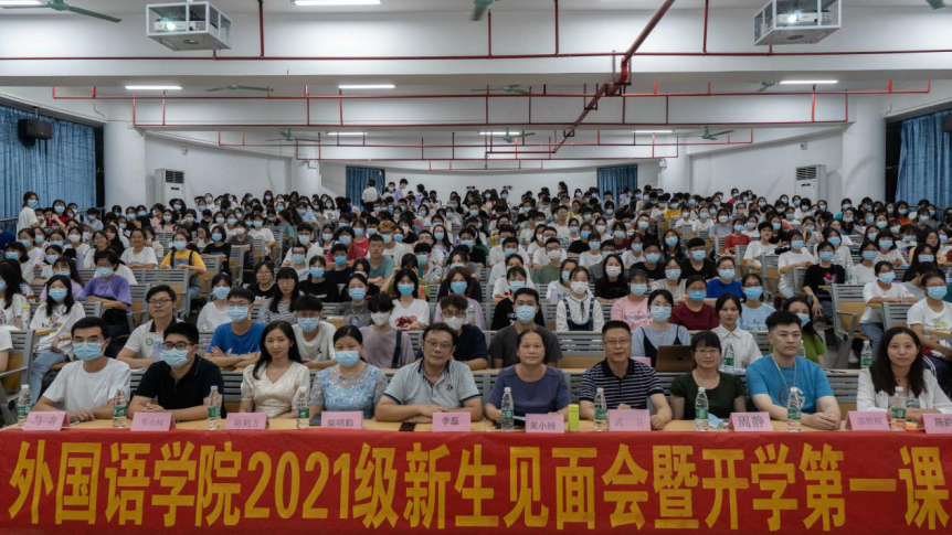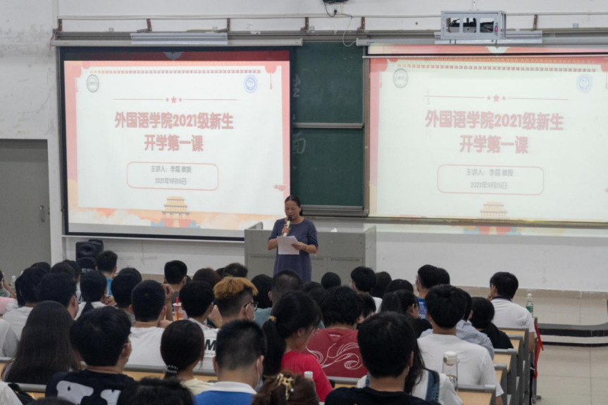 9月15日晚,外国语学院于D2小礼堂举行2021级新生见面会。出席本次会议的有外国语学院党委书记吴小玲、外国语学院院长李磊、党委副书记柴明勤、副院长武卫、外国语学院辅导员周静、邓永权、陈韵、刘阳、马奔、班主任代表陈鹤方、邵煜桐、2021级新生及助班参加本次会议。本次会议由党委书记吴小玲主持。
