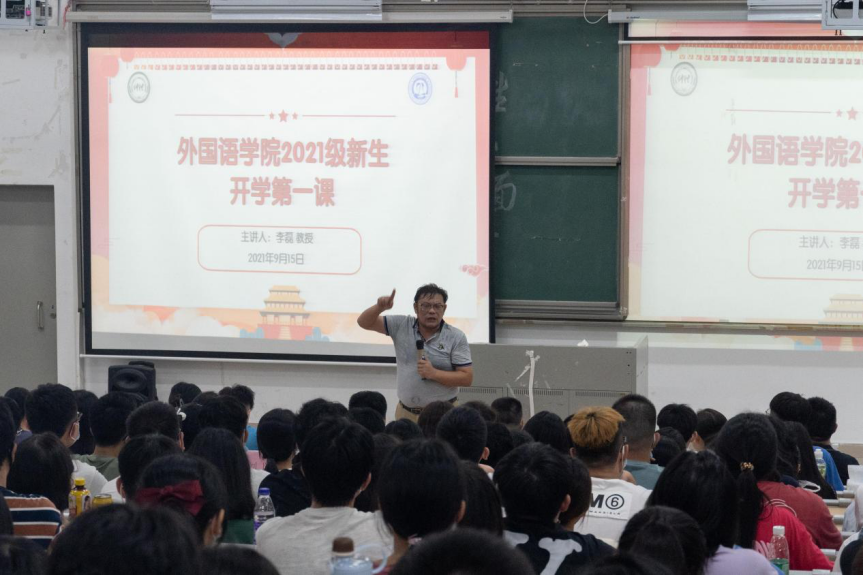 会议伊始,李磊为新生讲授开学第一课。他首先对新生们的到来表示热烈的欢迎。随后,他向新生们介绍了学校和学院的办学历史、文化,希望同学们能够爱校荣校。此外,他还为同学们介绍学院优秀教师,希望同学们能青出于蓝而胜于蓝。最后,他用Change、Confidence、Creation、Community、Cooperation寄托了对同学们的期望,即改变自己,增强自信,学会创造,融入集体,学会合作,成为一个独立人格的人。