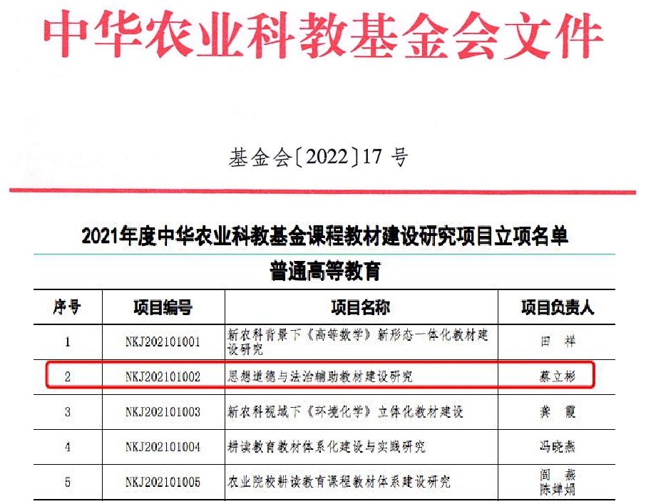 近日,中华农业科教基金会公布了2021年度中华农业科教基金课程教材建设研究项目立项结果,经过组织专家对各相关单位申报的472个项目进行了评审,146个普通高等教育项目和41个职业教育项目准予立项。其中,重点项目12个,一般项目61个,非资助项目114个。我校马克思主义学院院长蔡立彬教授申报的“思想道德与法治辅助教材建设研究”(项目编号:NKJ202101002)获立为2021年度中华农业科教基金课程教材建设研究项目重点项目。立项项目研究时间从2022年11月22日起,至2025年11月21日止。