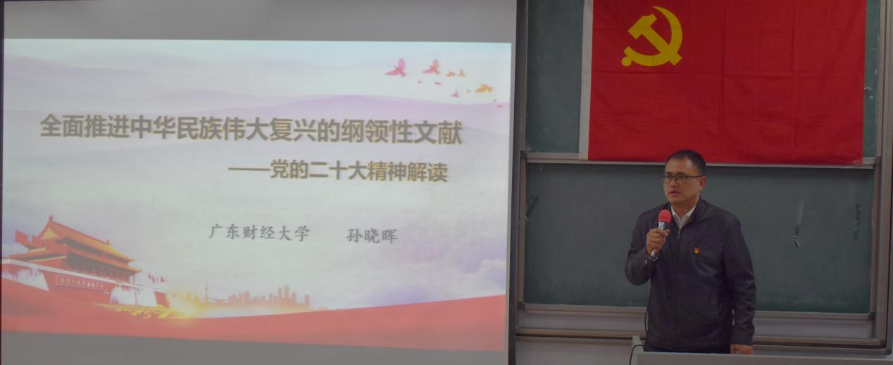 为深入学习宣传和全面贯彻党的二十大精神,2月23日下午,外国语学院于白云校区D栋707教室召开学习宣传党的二十大精神专题宣讲会,邀请“党的二十大精神”广东青年宣讲团成员、广东财经大学马克思主义学院副院长孙晓晖教授主讲。外国语学院全体师生党员参加学习,外国语学院党委书记柴明勤主持会议。