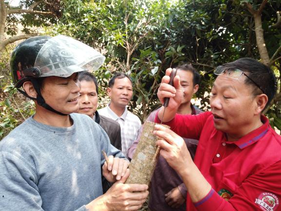 会场培训结束后,在陈镇长的陪同下,科技特派员和补会长团队又马不停蹄的前往示范果园,给农户们来了一场“手把手现场教学”,热情好学的农户们有着“学不会就不走”的坚定态度,纷纷上手操练大枝挑皮嫁接的技术要点,补会长也是耐心的、毫无保留的一个细节一个细节的给大家指导,直到大家都学会。