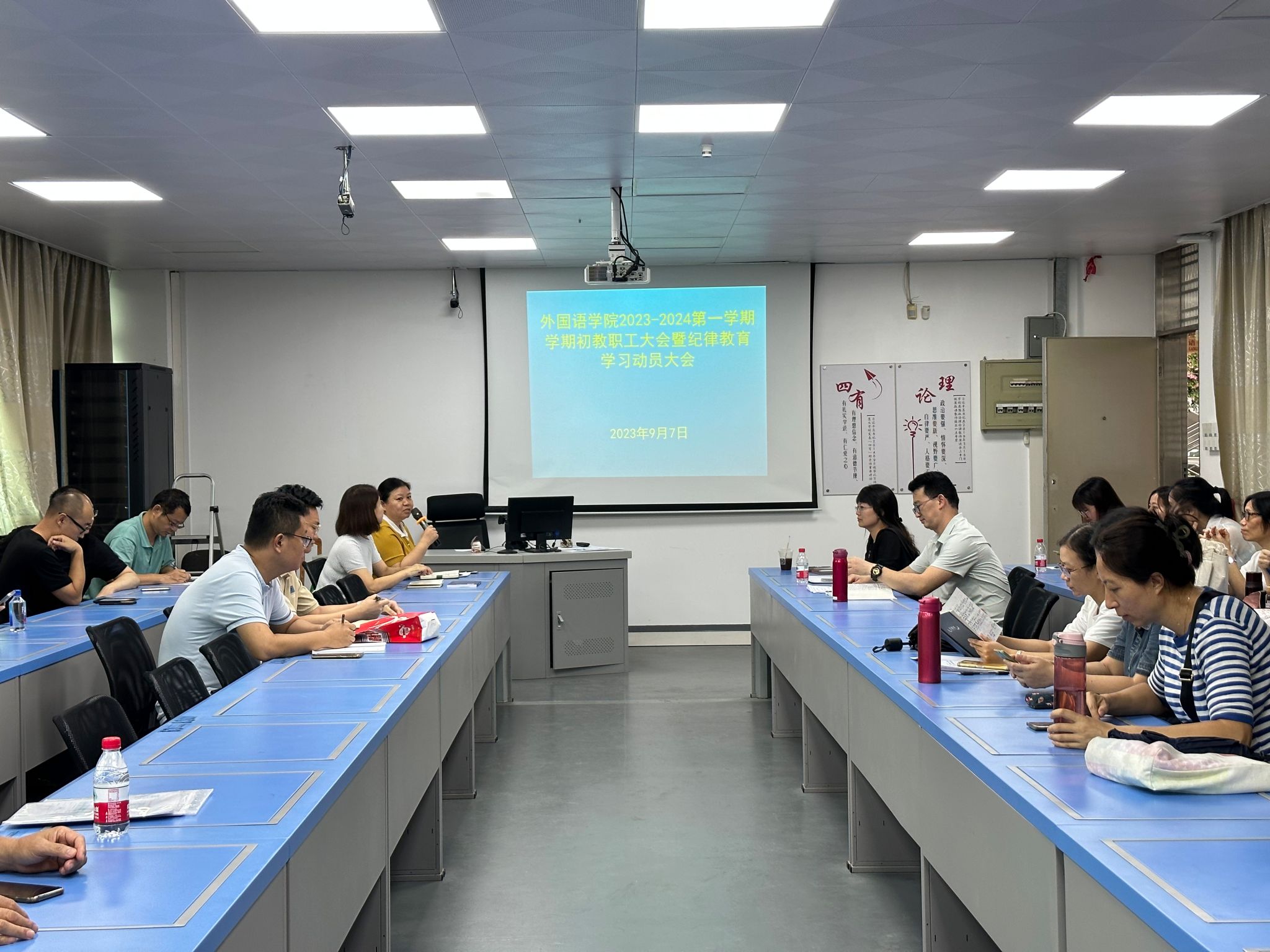 9月7日下午,外国语学院在海珠校区教学楼703召开新学期教职工大会暨纪律教育学习月活动动员大会,外国语学院全体教职工参加会议,会议由外国语学院党委书记柴明勤主持。