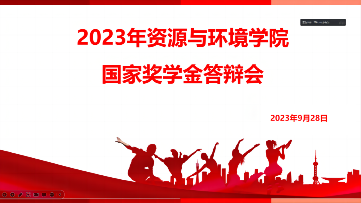 为扎实做好2023年国家奖学金评选工作,充分发挥优秀学生的示范引领作用,激励同学们努力进取。9月28日晚,资源与环境学院以线上会议的形式举行了2023年国家奖学金评选答辩会,学院党委书记黄礼彬、院长杨杰文、副书记邓艳桃,全体辅导员及学生代表担任本次答辩会评委。