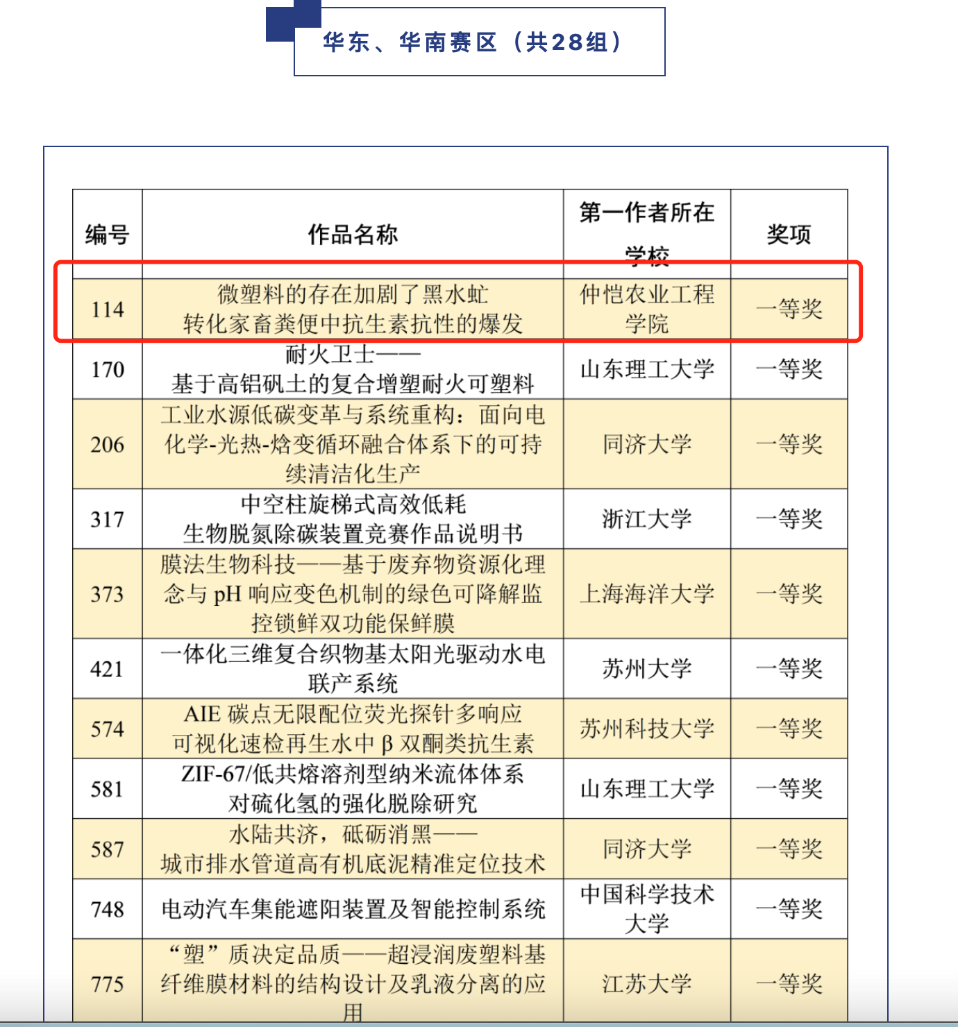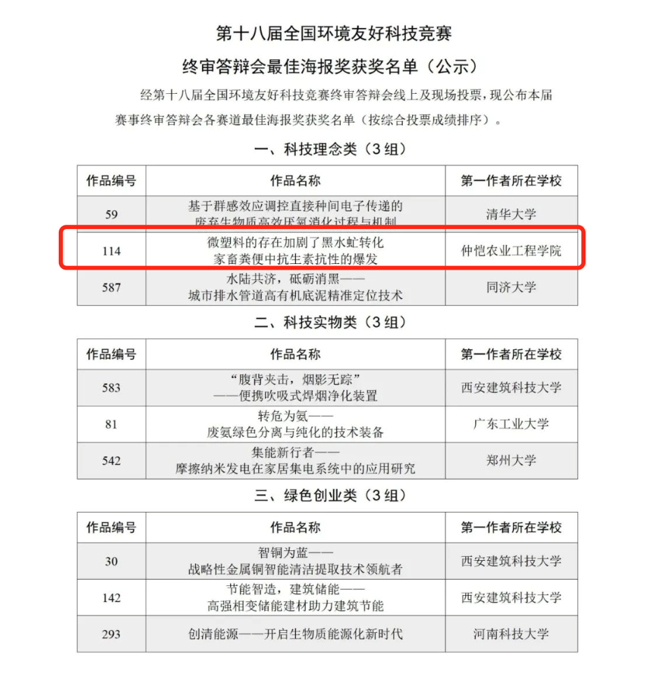 第十八届全国环境友好科技竞赛终审答辩于9月23日在清华大学环境学院举办。经大赛组委对科技理念类共483组作品进行评审后,共有22组作品进入终审答辩。我院吴新月、邓星莹、林丽红、梁浩杰、林铮与张玉雪6名同学在徐智敏副教授的带领下,凭项目《微塑料的存在加剧了黑水虻转化家畜粪便中抗生素抗性的爆发》获华东、华南赛区一等奖,并获清华大学终审答辩资格。