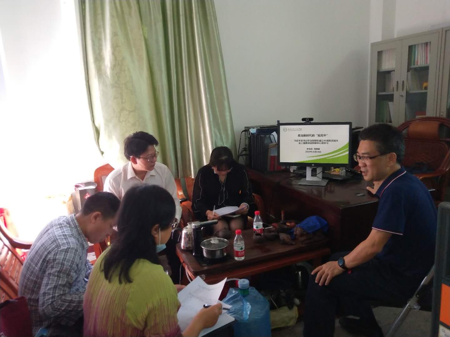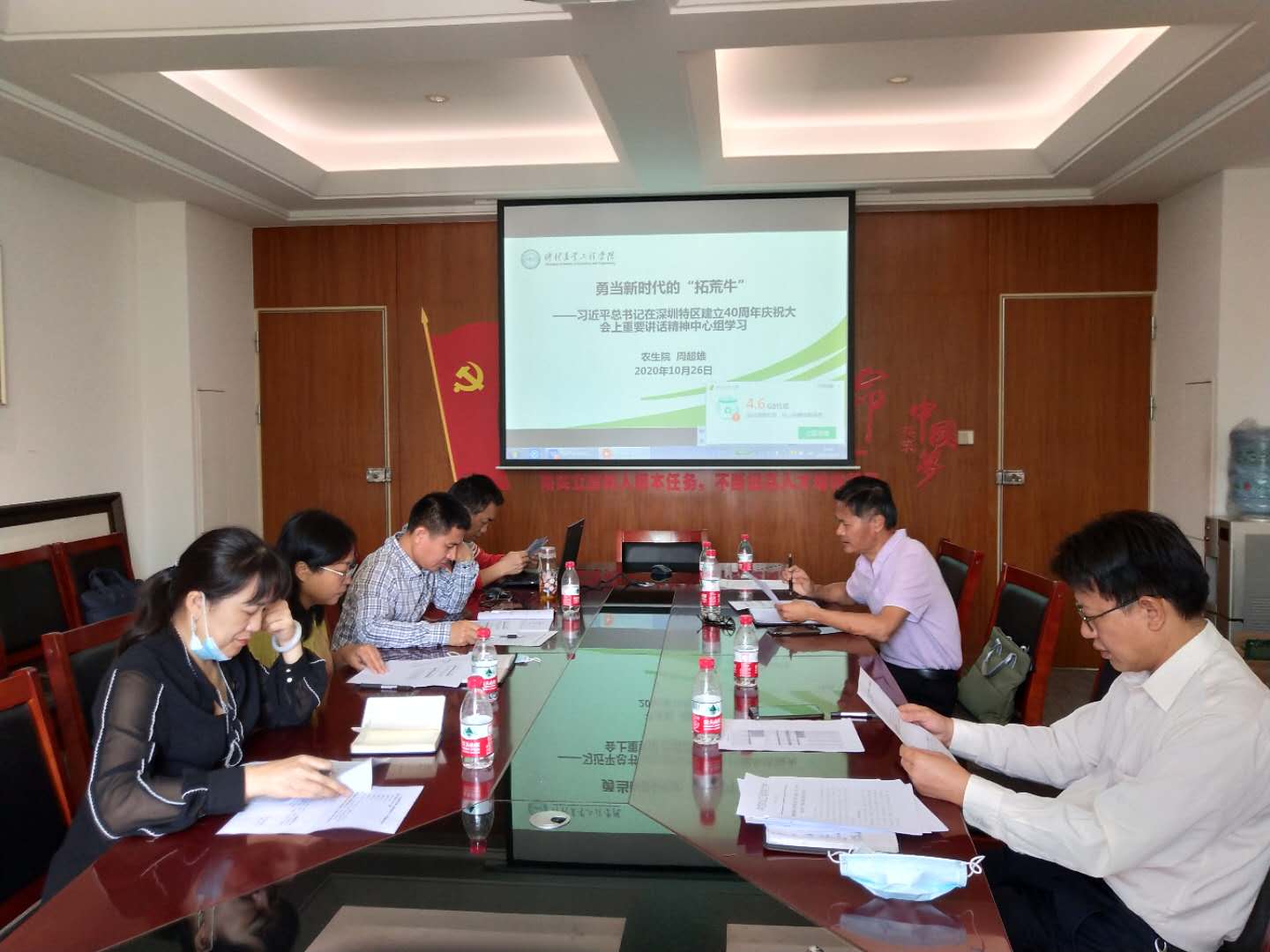 10月26日上午,农业与生物学院党总支召开中心组理论学习会议,专题学习习近平总书记在深圳特区建立40周年庆祝大会上的重要讲话精神,会议由党总支书记陈丹雄主持,全体领导班子成员及教工第一支部书记韩群鑫参加会议。
