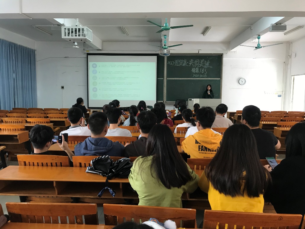 第一环节由心理委员谭淑文同学介绍班会召开背景,她深入浅出地讲解心理健康基础知识和心理问题缓解方法,分享大学生心理健康常识和注意事项。第二环节,班级分小组以PPT形式展示讨论成果,第一小组长李金萍提出与心理健康相关的小问题,邀请班长刘付柔示范“蝴蝶治疗”法,并与同学们积极互动;第二小组长陈剑锋同学以经典心理学实验“小狗和电击反应”为例,生动有趣地和大家讨论积极心理学的内涵和应用。班级成员踊跃发言、积极参与互动,气氛活跃。