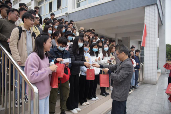 随后,周超雄、高结怡、孙晓芳、苏登与考生们合影留念并赠送考研大礼包。下午1点左右,专车出发,考研学子带着学院师生的祝福与礼物,奔赴考场。