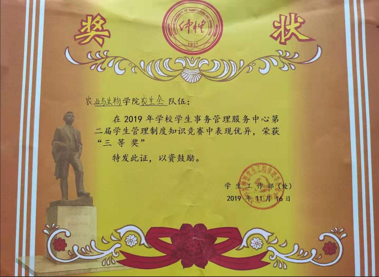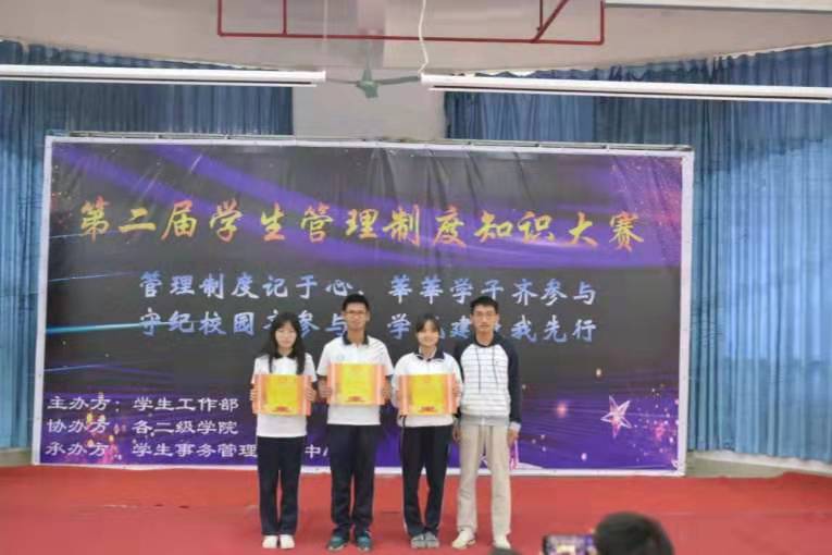 11月16日下午,由学生工作部(处)主办,学生事务管理服务中心承办,各二级学院协办的第二届学生管理制度知识大赛决赛在白云校区D1小礼堂隆重举行,我院派出的“农生全队”队伍在本次知识竞赛中荣获三等奖。