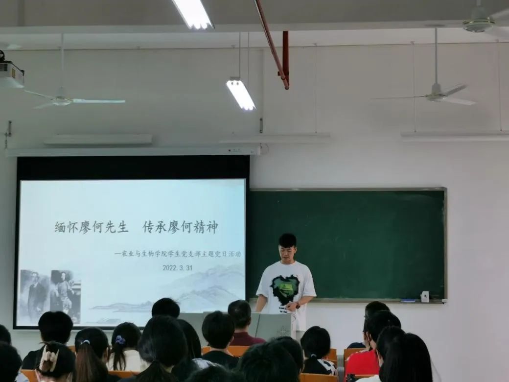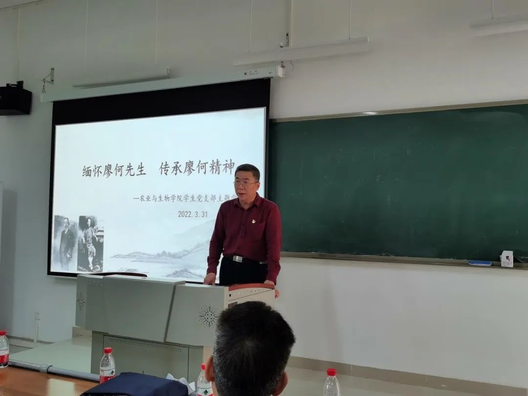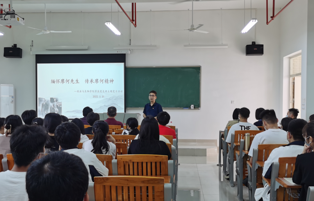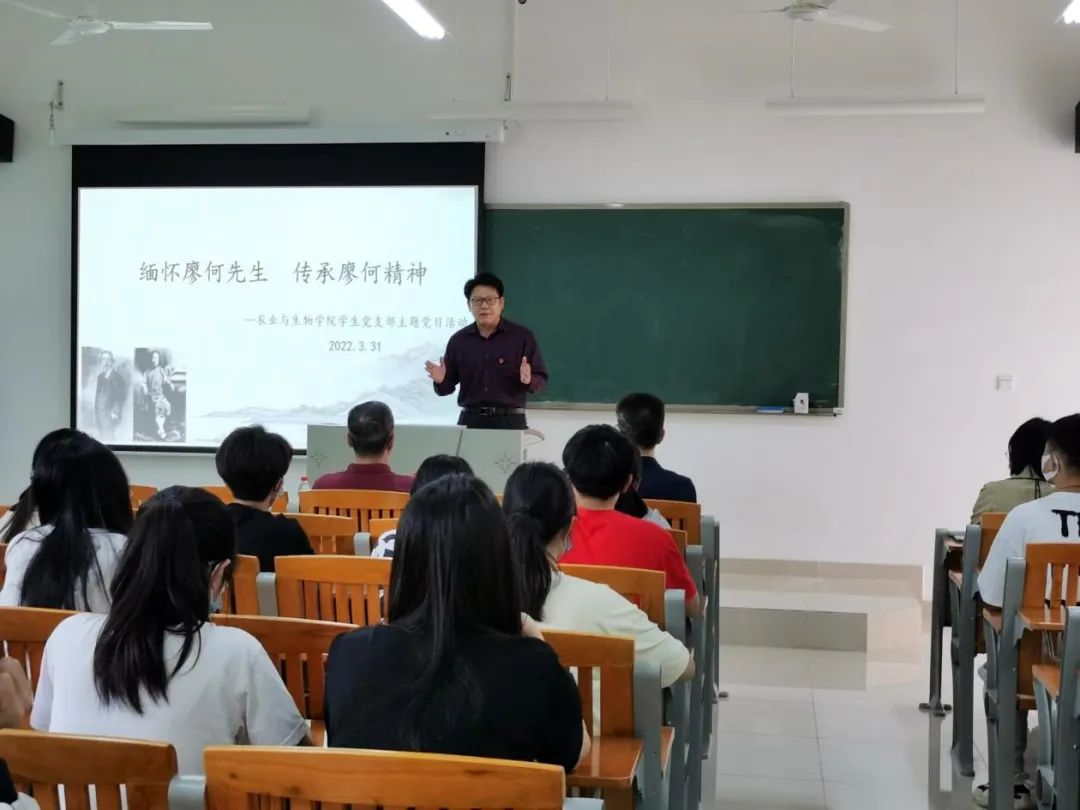 在建校九十五周年之际,为缅怀廖仲恺与何香凝先生,进一步传承廖何精神,3月31日,农业与生物学院于生命科学大楼A座501室召开以“缅怀廖何先生,传承廖何精神”为主题的党日活动,参与本次党日活动的有校党委委员、纪委副书记、纪检监察室主任刘兵,农业与生物学院党委书记陈丹雄,党委副书记周超雄,学院辅导员,学生党支部成员及各班优秀入党积极分子代表,会议由周超雄主持。