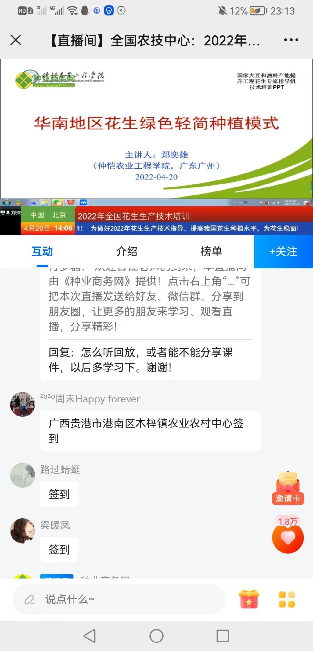 为做好2022年花生生产技术指导,提高我国花生种植水平,为花生稳面积、提产能提供应时应景坚实技术支撑,全国农业技术推广服务中心于4月20日下午举办了花生生产技术网络培训班。国家大豆和油料产能提升工程花生专家指导组成员、广东省大豆和油料产能提升工程花生专家指导组组长、我校农业与生物学院院长郑奕雄教授首先出场,专题讲授《华南地区花生绿色轻简高产种植模式》;随后,辽宁省沙地治理与利用研究所于国庆研究员、山东省花生研究所曲明静研究员分别就《东北地区花生绿色高产高效技术模式》和《花生苗期病虫草害综合防控技术》进行专题授课。来自全国花生主产区的各级农技人员及花生种植大户、合作社代表参加了培训。我校花生产业创新团队、农业与生物学院作物学创新团队以及部分师生在海珠校区401智慧课室观看直播。截至培训当天18时,培训直播累计点击量逾32.8万人次。