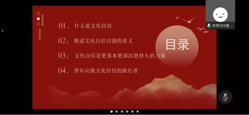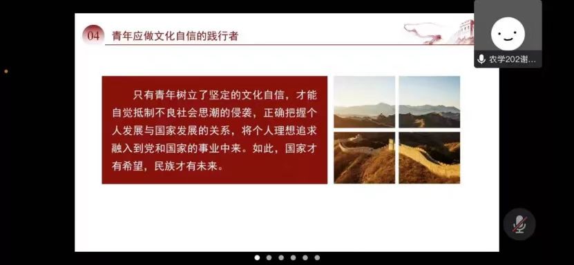 谢诗莉围绕“文化自信”向同学们分享了文化自信于当代青年的意义。她表示,当代青年只有树立了坚定的文化自信,才能自觉抵制不良思想和社会风气的侵蚀,才能正确把握个人发展与国家发展的关系,将个人理想追求融入到党和国家的事业中来。