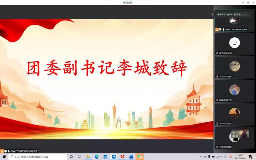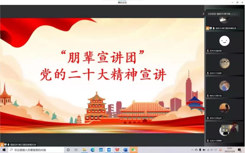 为全面贯彻习近平新时代中国特色社会主义思想,弘扬伟大建党精神,提高同学们的政治素养,学习、宣传、贯彻党的二十大精神,12月6日下午,农业与生物学院以线上会议的形式进行了党的二十大精神宣讲会议。出席本次会议的有我校“学习贯彻宣传党的二十大精神青年宣讲团”成员李城,农业与生物学院学生会主席团成员熊文豪、融媒体中心主任谢诗莉和2021级全体同学。