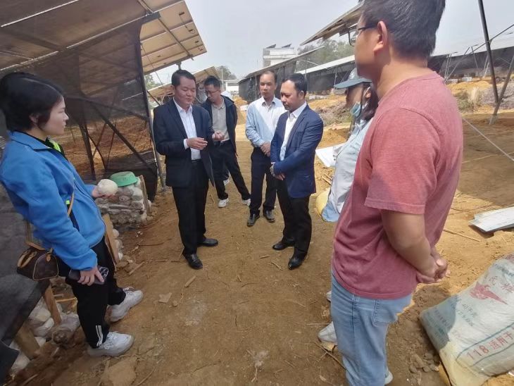 在罗定船健农业科技发展有限公司食用菌种植基地,种植人员详细的和科技特派员团队介绍了目前“光伏”太阳能板下平菇、猴头菇、红松茸等食用菌的种植情况、规模以及销售渠道,目前食用菌种植技术较为成熟,销售路径包括网上商城、采摘直供等多种销售途径,食用菌供应处于供不应求的阶段,后续会加大种植面积,扩大产业规模。
