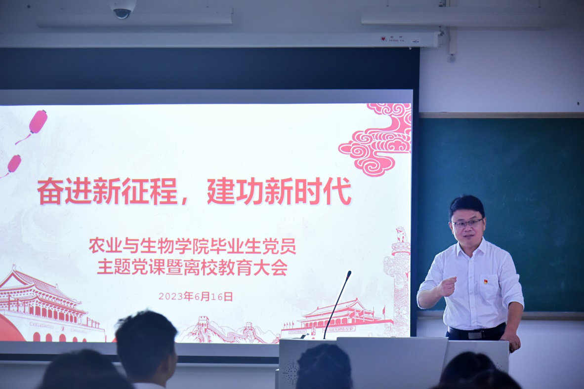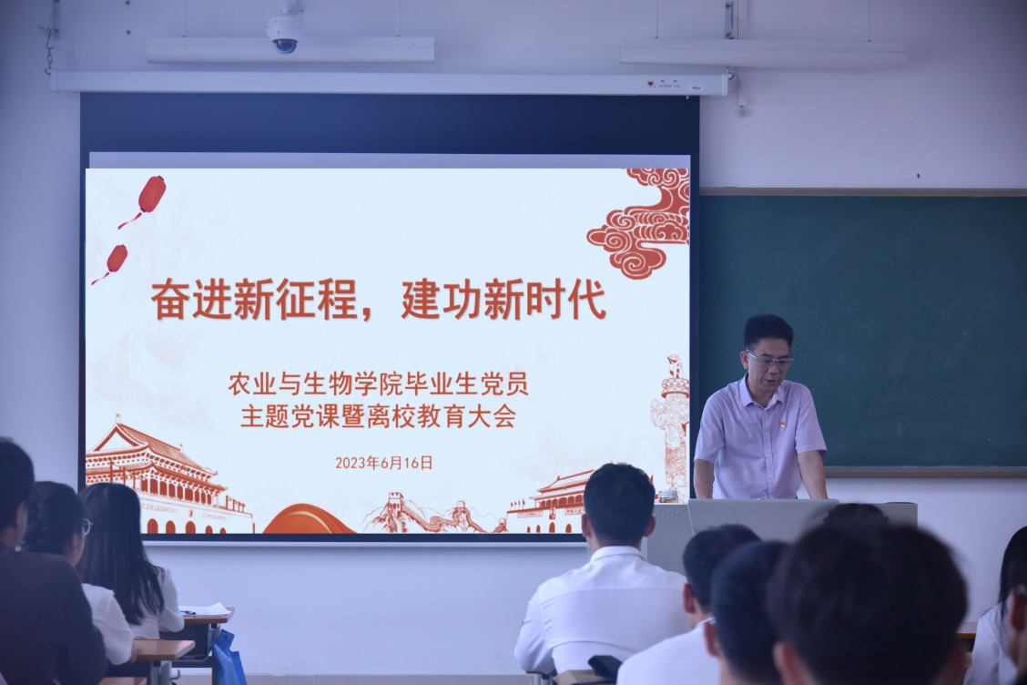 为深入学习贯彻习近平新时代中国特色社会主义思想,强化毕业生党员身份与责任教育,引导毕业生党员在学思践悟中坚定理想信念,在奋发有为中践行初心使命,6月16日下午,农业与生物学院在生科A508开展了毕业生党员主题党课暨离校教育大会。学院党委书记周超雄,党委副书记、副院长(主持工作)喻国辉,党支部书记孙晓芳、苏登以及2023届全体毕业生党员参加。本次活动由孙晓芳主持。