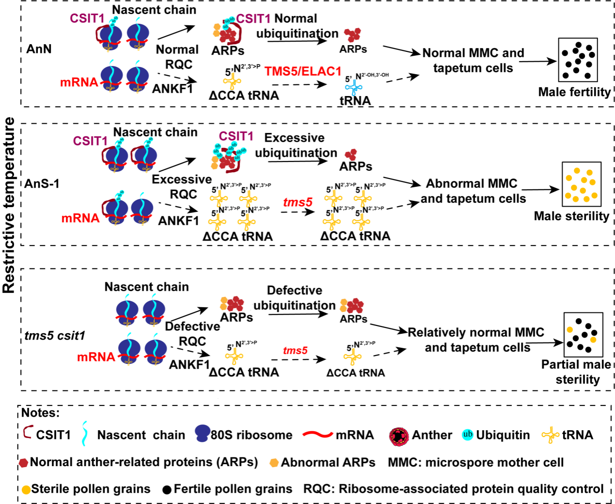 两系杂交水稻育种是我国科学家首创的育种技术,相比三系杂交水稻育种技术,它具有不受恢保关系限制、配组自由、更加有利于利用杂种优势、育种程序更加简单和成本降低等优势,因而得到了迅速的发展。两系杂交水稻由环境敏感型雄性不育系和恢复系组成。由于水稻温敏雄性不育基因tms5遗传比较稳定,目前95%以上的两系杂交水稻的不育系是利用该基因。温敏雄性不育的不育起点温度(critical sterility-inducing temperature,CSIT)是指雄性育性从可育转变为不育的临界温度,它是保障两系杂交水稻制种安全的关键。然而,许多温敏核雄性不育的不育起点温度偏高或者遗传漂移,在杂交制种时偶遇低温天气可能导致制种失败而造成巨大的经济损失,限制了两系杂交水稻的发展。目前,有关不育起点温度基因的克隆和分子机制尚未有公开报道。 作者通过辐射诱变AnS-1的种子筛选到了两个不育起点温度改变的突变体,分别命名为tms5 csit1-1和tms5 csit1-2。经过鉴定,tms5 csit1-1和tms5 csit1-2突变体的表型相似,不育起点温度均从AnS-1的26℃升至32℃。图位克隆和遗传验证显示CSIT1编码一个1,921个氨基酸的RING型E3泛素连接酶,tms5 csit1-1和tms5 csit1-2是等位突变体。 进一步研究发现CSIT1与80S核糖体互作参与蛋白质质量控制。高温导致AnS-1中过度积累UbL40(含泛素)和蛋白质稳定性降低,可能引起蛋白质质量控制过程过度敏感,CSIT1异常泛素化降解CAT等花粉发育相关蛋白,导致绒毡层和小孢子发育异常;同时,蛋白质量控制过程产生的2,3 -环磷酸化ΔCCA tRNA不能被功能缺失的TMS5加工成能够重新利用的tRNA,直接或者间接的影响花药发育。而在tms5 csit1突变体中,CSIT1的突变导致蛋白质质量控制系统失速,不能过度泛素化这些花粉相关的蛋白,也不能过度积累2,3 -环磷酸化ΔCCA tRNA,导致育性的部分恢复和不育起点温度的上升(图1)。 总之,作者发现CSIT1通过核糖体偶联的蛋白质质量控制过程调节水稻温敏雄性不育系的不育起点温度,为解决水稻两系杂交育种中水稻温敏雄性不育系不育起点温度的选育问题提供了潜在途径。