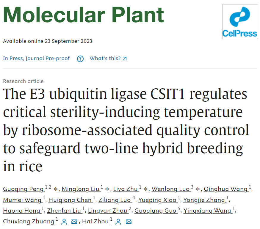 近日,农业与生物学院仲恺青年学者彭国清以第一作者在Molecular Plant(IF=27.5)上发表题为“The E3 ubiquitin ligase CSIT1 regulates critical sterility-inducing temperature by ribosome-associated quality control to safeguard two-line hybrid breeding in rice”的研究论文(https://www.cell.com/molecular-plant/fulltext/S1674-2052(23)00287-3),首次揭示了E3泛素连接酶CSIT1通过蛋白质质量控制过程调控水稻温敏雄性不育的不育起点温度的分子机制。