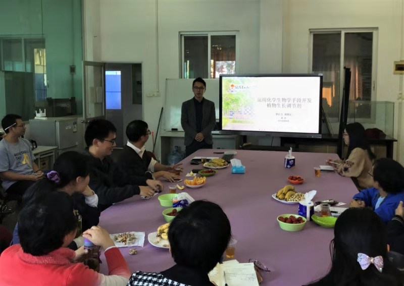 当日上午,姜博士和孙博士分别作了题为“运用化学生物学手段开发植物生长调节剂”和“小分子PZA抑制拟南芥乙烯生物合成作用机制研究”的报告,详细介绍了他们所在研究团队近年在化学生物学领域新功能化合物筛选、设计及其作用机制的主要研究成果,其中部分成果已在国际知名刊物《Nature Communication》和《Molecular Plant》等发表。接着,我校农业与生物学院何生根教授及其团队研究生李杨分别作了题为“团队鲜切花采后衰老与保鲜研究进展”和“2-吡啶甲酸对香石竹切花采后衰老的调控与机制研究”的简要汇报。报告会由何生根教授主持,农业与生物学院及园艺与园林学院的部分老师和研究生、佛山林业科学研究所农艺师丁岳炼、广东大观农业科技有限公司农化部经理冼锡金等参加了学术报告会。