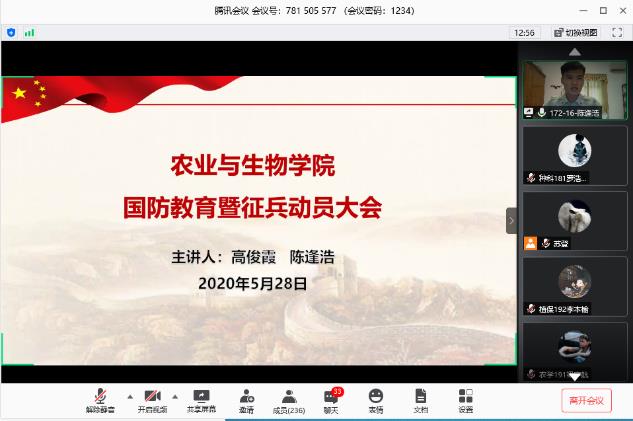 为鼓励更多同学响应国家号召,积极报名投身军旅,在军营中磨砺自我、提高自我,5月28号下午,农业与生物学院通过腾讯会议平台召开2020年国防教育暨征兵动员大会。辅导员高结怡、苏登以及17级退伍学生陈逢浩、16级退伍学生高俊霞参加了本次会议。会议由苏登老师主持。