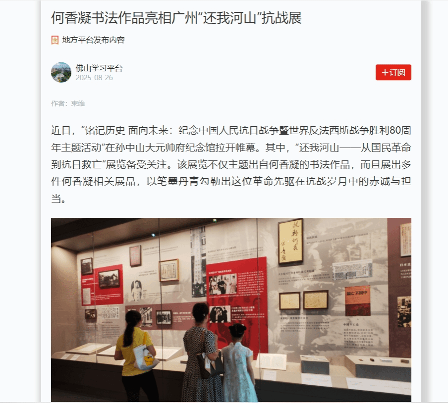 近日,“铭记历史 面向未来:纪念中国人民抗日战争暨世界反法西斯战争胜利80周年主题活动”在孙中山大元帅府纪念馆拉开帷幕。其中,“还我河山——从国民革命到抗日救亡”展览备受关注。该展览不仅主题出自何香凝的书法作品,而且展出多件何香凝相关展品,以笔墨丹青勾勒出这位革命先驱在抗战岁月中的赤诚与担当。