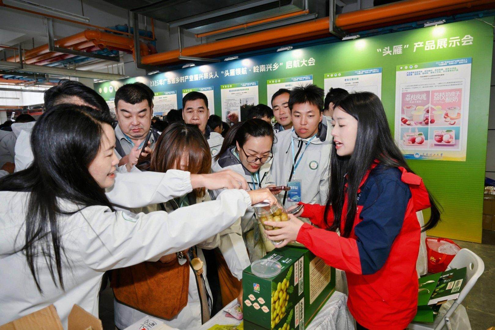 启动仪式前,会场外的“头雁”教学成果展与产品展示会已热闹启幕,成为本次活动的一大亮点。展区内分设四大板块,全方位呈现“头雁”项目培育成效与乡村产业活力。产品展示区里,来自三校学员的特色农产品琳琅满目,涵盖南药、丝苗米、油柑深加工产品、茶叶等各类优质成果,既展现了学员的产业实践成果,也为供需对接搭建了现场平台。