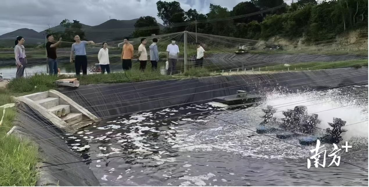 “智慧农业团队”刘双印教授(左三)在阳江现场指导陆基池塘高密度水产养殖的增氧设备运行。 受访者 供图