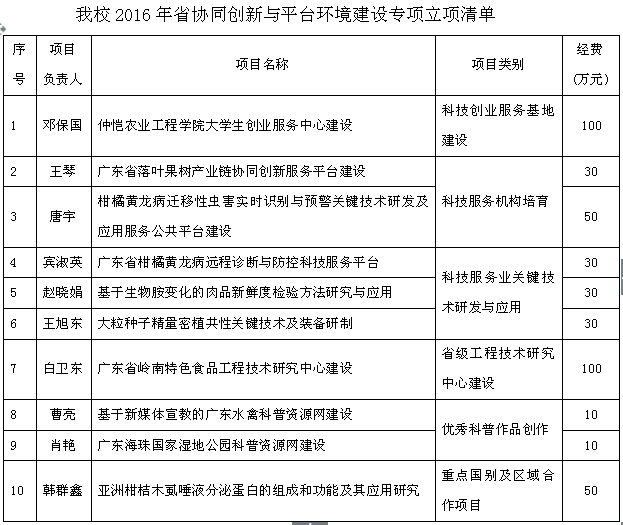 近日,从广东省科技厅获悉,仲恺农业工程学院10个项目获省协同创新与平台环境建设专项立项,资助经费共计440万元。其中邓保国教授申报的“仲恺农业工程学院大学生创业服务中心建设”,是仲恺农业工程学院首次获得的科技创业服务基地立项,资助经费100万元。