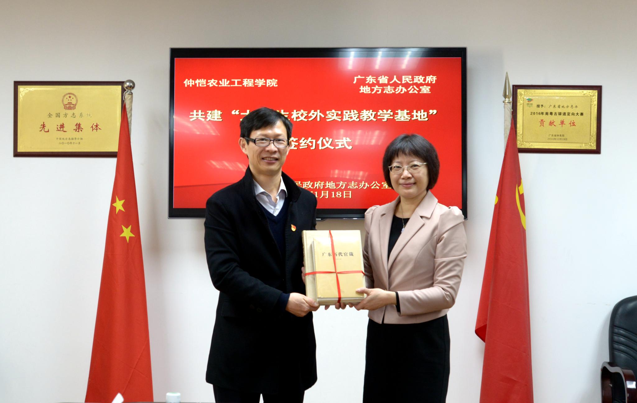 1月18日上午,仲恺农业工程学院副校长朱立学率队到广东省人民政府地方志办公室与该单位签约共建“大学生社会实践(实习)教学基地”,我校教务处处长石玉强、宣传部部长曾献尼、人文与社会科学学院院长曾秀兰、省地方志办副主任刘卫、人事秘书处处长王道钰、地方史处处长王涛、方志资源开发处处长田亮、广东年鉴社社长莫秀吉、广东省方志馆馆长陈宏亮以及相关工作人员出席仪式。