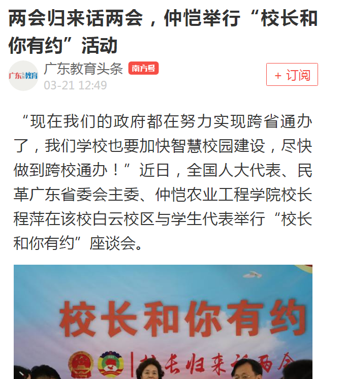 “现在我们的政府都在努力实现跨省通办了,我们学校也要加快智慧校园建设,尽快做到跨校通办!”近日,全国人大代表、民革广东省委会主委、仲恺农业工程学院校长程萍在该校白云校区与学生代表举行“校长和你有约”座谈会。