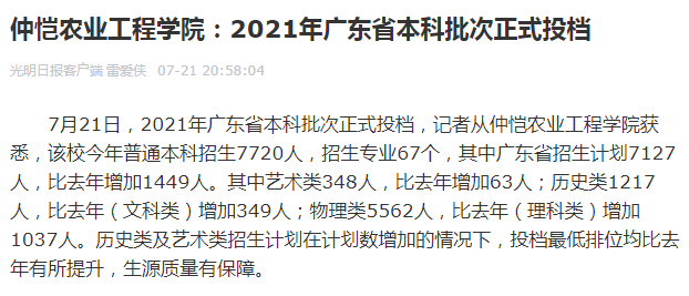 7月21日,2021年广东省本科批次正式投档,记者从仲恺农业工程学院获悉,该校今年普通本科招生7720人,招生专业67个,其中广东省招生计划7127人,比去年增加1449人。其中艺术类348人,比去年增加63人;历史类1217人,比去年(文科类)增加349人;物理类5562人,比去年(理科类)增加1037人。历史类及艺术类招生计划在计划数增加的情况下,投档最低排位均比去年有所提升,生源质量有保障。