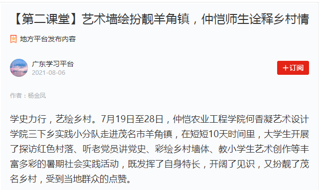 学史力行,艺绘乡村。7月19日至28日,仲恺农业工程学院何香凝艺术设计学院三下乡实践小分队走进茂名市羊角镇,在短短10天时间里,大学生开展了探访红色村落、听老党员讲党史、彩绘乡村墙体、教小学生艺术创作等丰富多彩的暑期社会实践活动,既发挥了自身特长,开阔了见识,又扮靓了茂名乡村,受到当地群众的点赞。