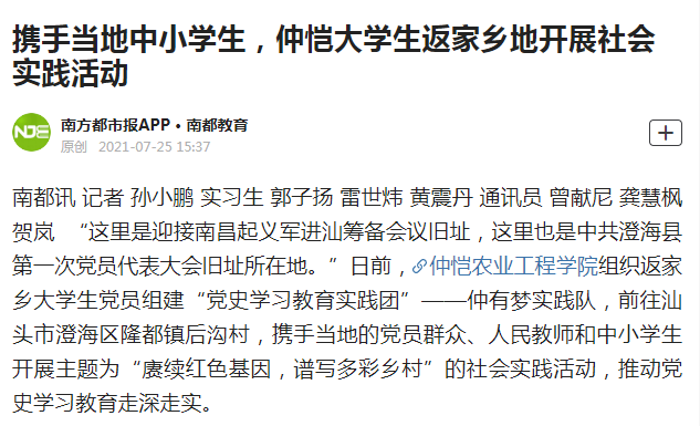 “这里是迎接南昌起义军进汕筹备会议旧址,这里也是中共澄海县第一次党员代表大会旧址所在地。”日前,仲恺农业工程学院组织返家乡大学生党员组建“党史学习教育实践团”——仲有梦实践队,前往汕头市澄海区隆都镇后沟村,携手当地的党员群众、人民教师和中小学生开展主题为“赓续红色基因,谱写多彩乡村”的社会实践活动,推动党史学习教育走深走实。