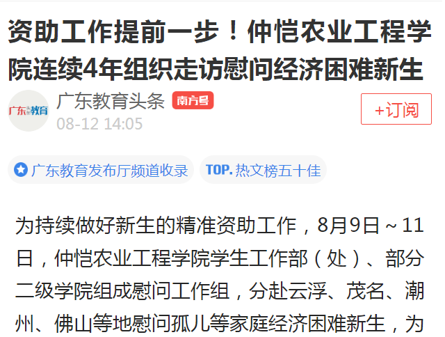 为持续做好新生的精准资助工作,8月9日~11日,仲恺农业工程学院学生工作部(处)、部分二级学院组成慰问工作组,分赴云浮、茂名、潮州、佛山等地慰问孤儿等家庭经济困难新生,为他们送去录取通知书和慰问金,将资助工作提前一步,以爱启航仲恺学子求学之路。