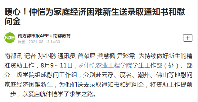 为持续做好新生的精准资助工作,8月9~11日,仲恺农业工程学院学生工作部(处)、部分二级学院组成慰问工作组,分别赴云浮、茂名、潮州、佛山等地慰问家庭经济困难新生,为他们送去录取通知书和慰问金,将资助工作提前一步,以爱启航仲恺学子求学之路。