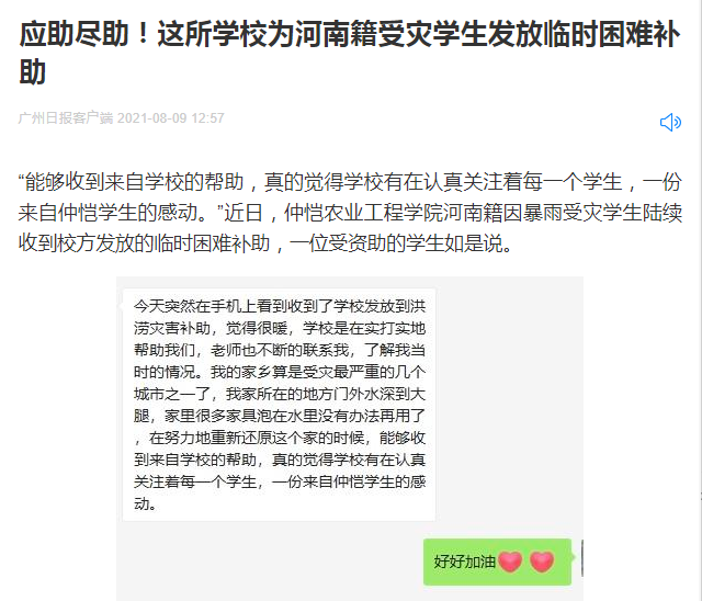 记者从仲恺农业工程学院了解到,该校第一时间启动应急救助机制,设立因洪涝灾害致困学生临时困难专项补助,为河南籍因暴雨受灾学生每人发放2000元临时困难补助。